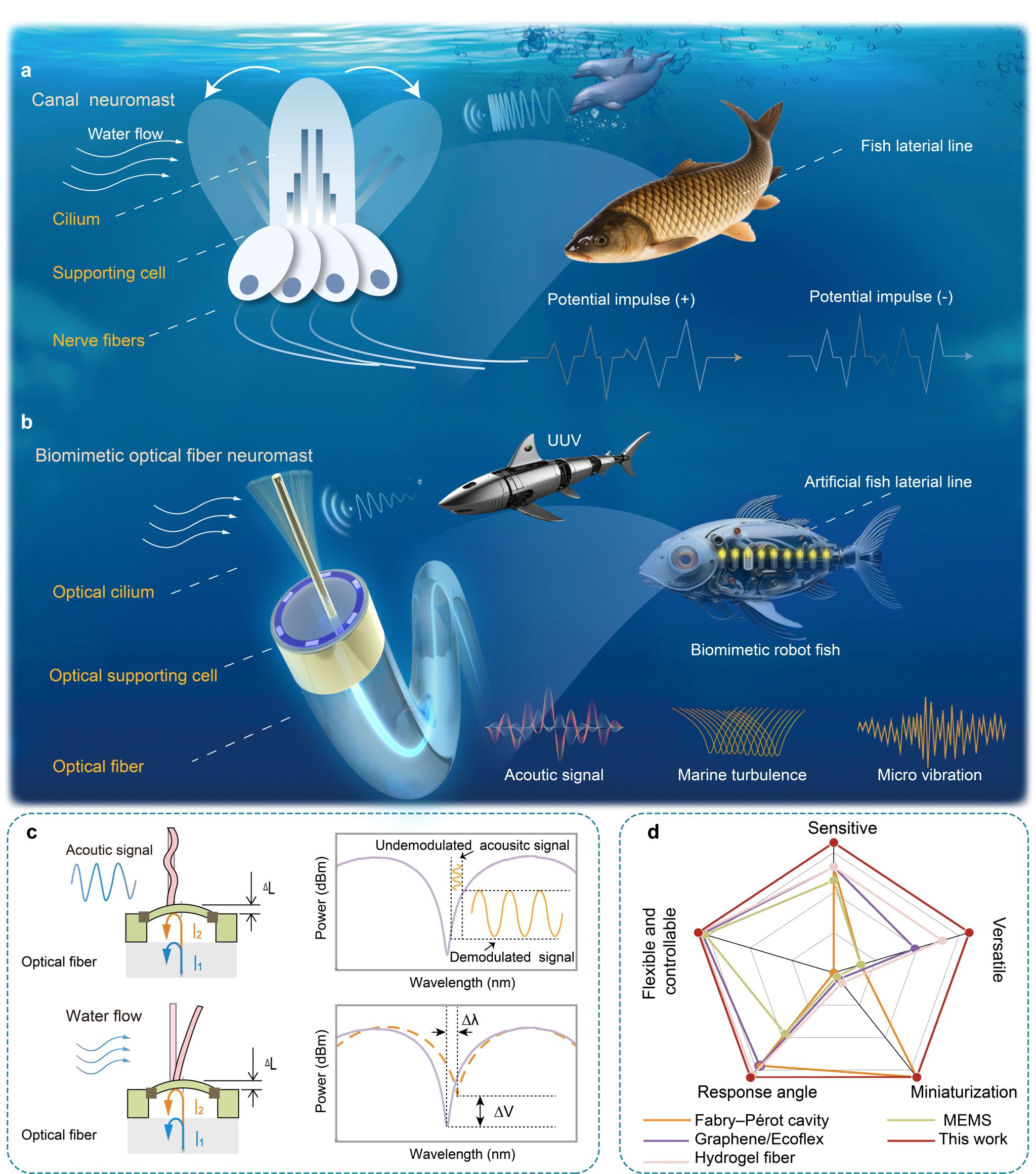 (通讯员 郭华)近日,z6mg人生就是博官网青年教师李良晔博士作为共同第一作者和核心完成人取得重要科研突破。该研究由李良晔和华中科技大学光学与电子信息公司孙琪真教授团队以及武汉光电国家研究中心熊伟教授团队合作,提出并设计了一种用于多功能水下探测与通信的仿生光纤神经丘,实现水下声学信号、流体运动及机械振动的高精度感知,并成功集成目标成像与水下通信功能,为水下全光学仿生感知开辟了新途径作出重要贡献。研究成果以“From fish to fiber: 3D-nanoprinted optical neuromast for multi-integrated underwater detection”为题发表于《Nature Communications》。